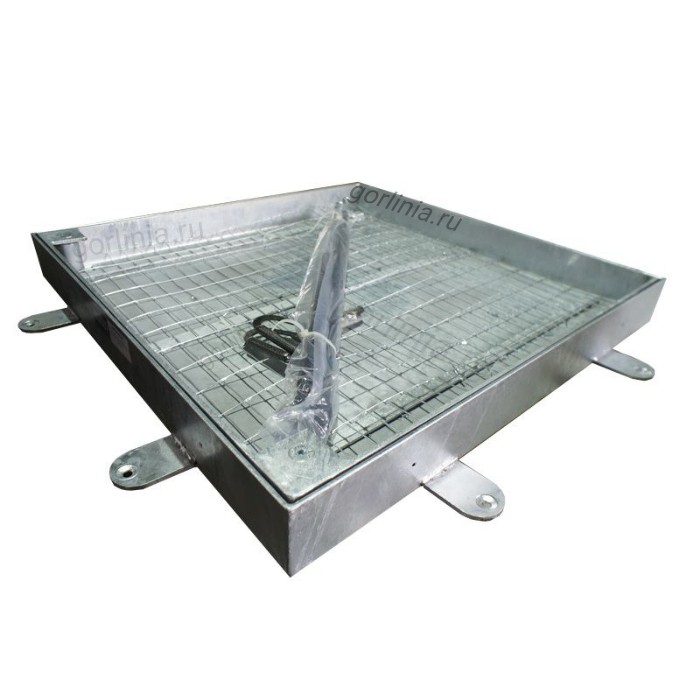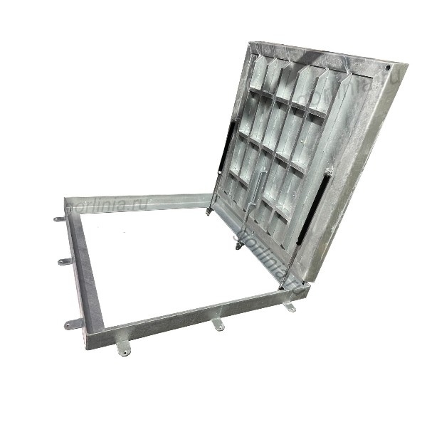 Модель с внешними разъемными шарнирами на болтах для возможности покрытия цинком. Механизм с усиленными газлифтами 2000Н, стопорным устройством автоматической фиксации в открытом положении. Запорное устройство на винтах. Две съемные рукоятки по углам для поднятия крышки. Ленточное эластичное уплотнение по притвору.