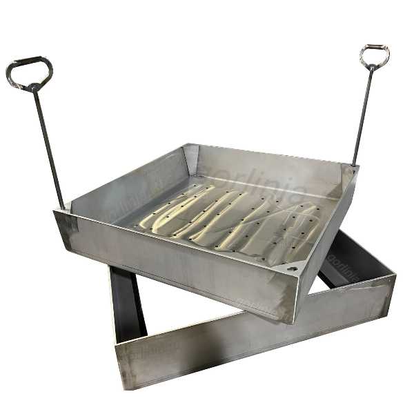Крышку вынимают специальными крюками с т-образными наконечниками через отверстия по углам. Закажите исполнение с крепежными ушами (пластинами) для удобства монтажа и выставления в уровень земли. Усиление каркаса корыта профилем является доп. опцией (см. фотогалерею)